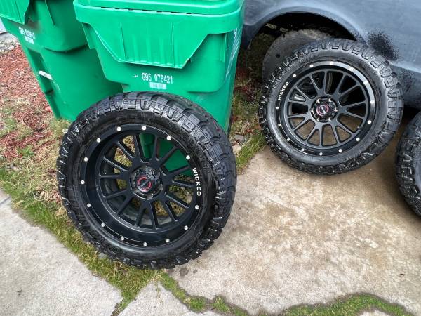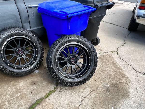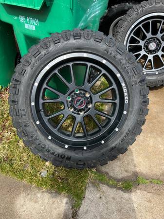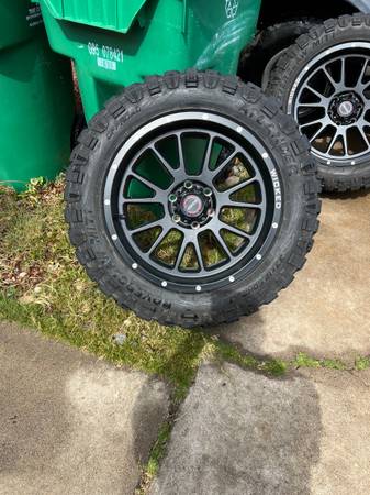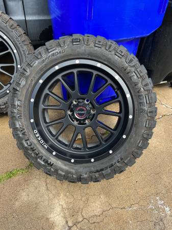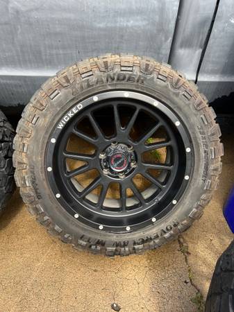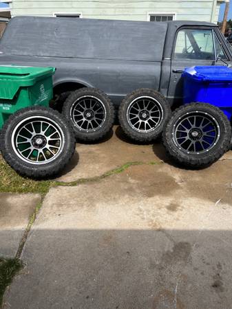 The Four Wheels are in New Condition.20” Matte Black Rims with 33” Mud Tires 75% Tread.lug nut Locks and All Center Caps for GM.6x5.5.chevy,gmc,Cadillac.Truck,and or SUV.2x4,4x4.Many other 6 Lug...