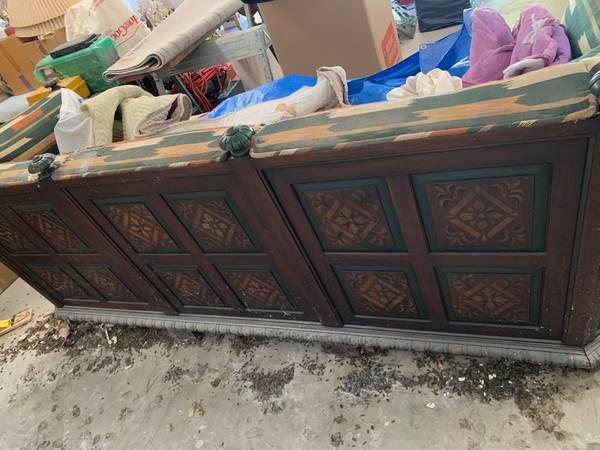 We have two six foot long couches made of wood. Upholstery is not in good shape but the hand painted Mexican style wood is in very good shape. Needs to be clean. The chair is also in the same condition. They have been garaged for years so not exposed to sunlight. Very heavy furniture and will need a van/truck to move with at least two people.