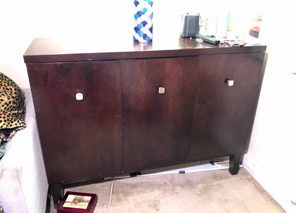 Large buffet from Z Gallerie. Years ago, was $1100. A little beat up but yours for free if collected by noon on Friday, 10/24. Doors can be adjusted to hang straighter, and top can be stained or covered. You will need to bring your own helper to move it. Has shelves on inside. Would make a great storage piece.