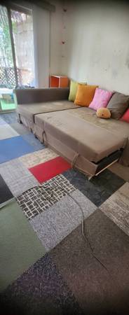 Free IKEA sofa that can turn into a sofa bed. Include pillows that originally comes with the sofa but not the colorful pillow COVERS. The original pillow covers color is brown, the same color as the sofa.