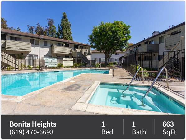 Welcome to Bonita Heights, a beautiful residential community featuring one & two bedroom apartments in Bonita, CA overlooking a lush river valley. Our spacious floor plans each offer private outdoor space and many unique amenities. We also feature a welcoming community area with a pool, spa, BBQs and more. Along with exceptional professional service, Bonita Heights is an ideal location for those who are looking for a quiet neighborhood yet close to major freeways for an easy commute. Contact us to schedule a tour today!