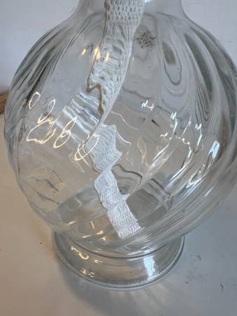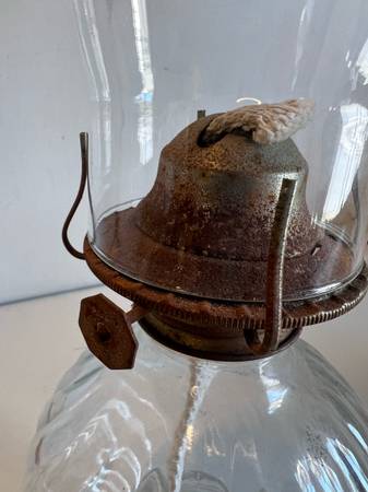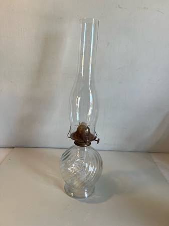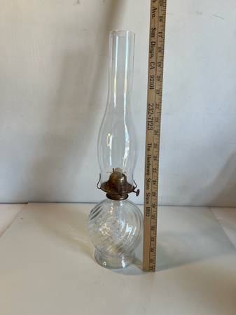 This is a beautiful, large clear glass oil lamp from Kaadan Ltd., featuring a distinctive swirl pattern on the base. It is in excellent pre-owned condition, with the glass free of chips or cracks, and the original wick burner showing some natural patina, adding to its vintage charm. This lamp stands approximately 17 inches tall, Perfect for ambient lighting, rustic decor, or as a collectible item for those who appreciate vintage glass and lighting fixtures.