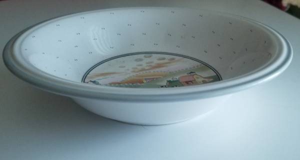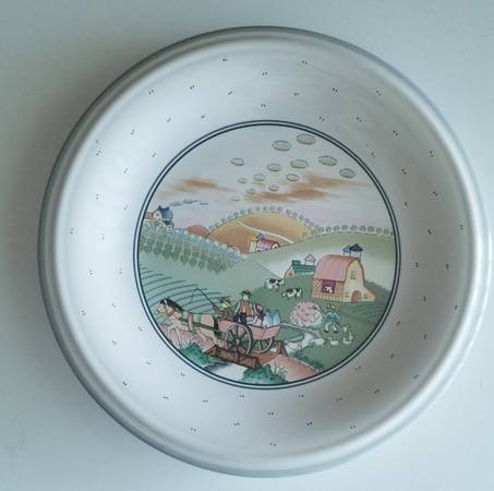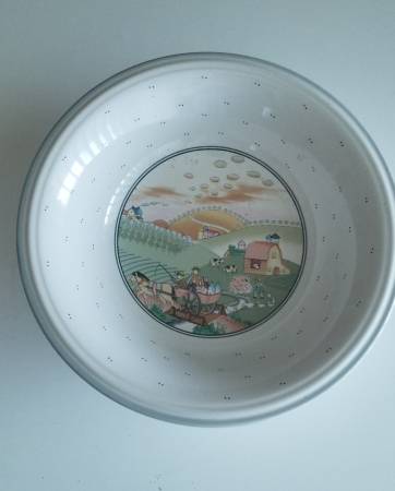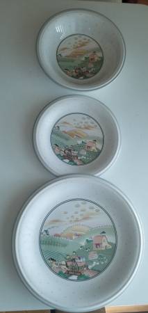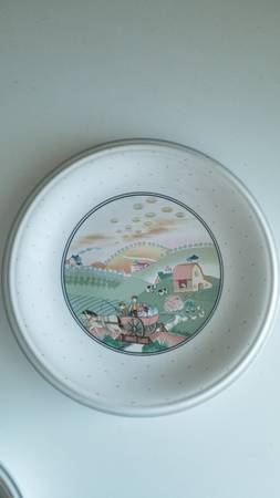 Beautiful collectible Dinner set of 3 Dinner plate diameter- 11".3 desserts plate --7 3/4 "&3 bowls- 8".Pattern :Homecoming by Home Beautiful. Farm scene , dotted border,grey trim .Pattern...