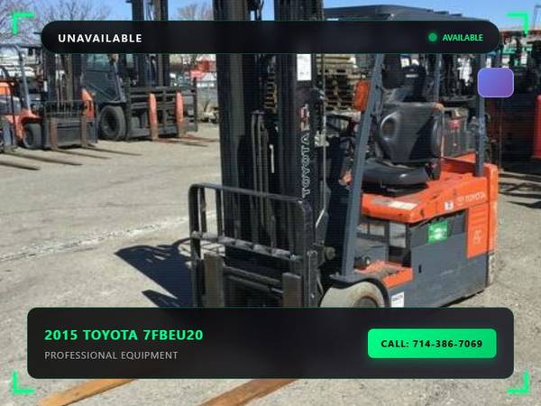Photo 20: 2015 Toyota 7FBEU20 Capacity: 4,000 lbs Fuel: Electric Subcategory: Cushion Tire 4 Wheel Sit Down (Indoor Warehouse) Mast Type: Three Stage Mast Height: 83 / 189 in Side Shifter: Yes Hours: 5,813 Condition: Used