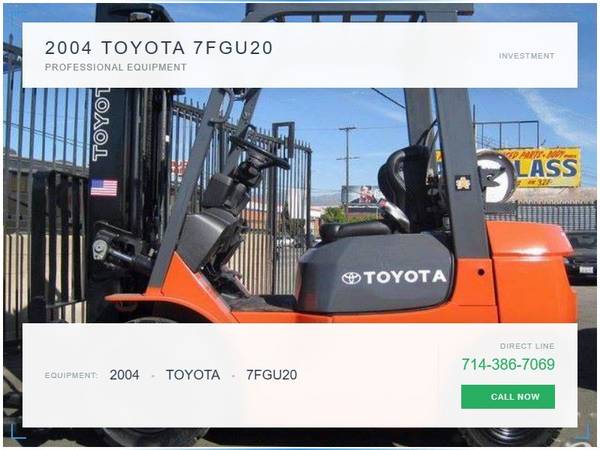 2004 Toyota 7FGU20 • Candace • 714-386-7069 24 FORKLIFTS AVAILABLE • MULTIPLE BRANDS • 3,000 lbs to 36,000 lbs