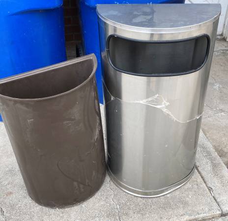 Rubbermaid 9 gal Stainless Steel Half Round Trash Receptacle With Plastic Liner - 18"L x 9"W x 32"H I have removed the protective plastic and cleaned the surface Pick up is as shown on the map. I do...