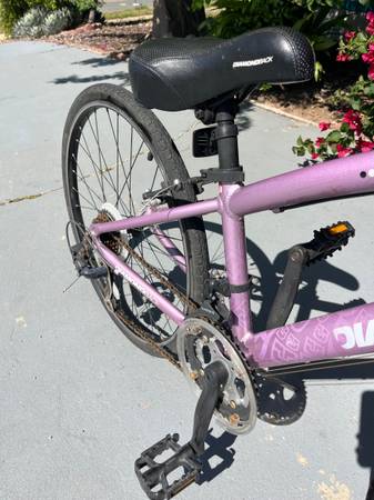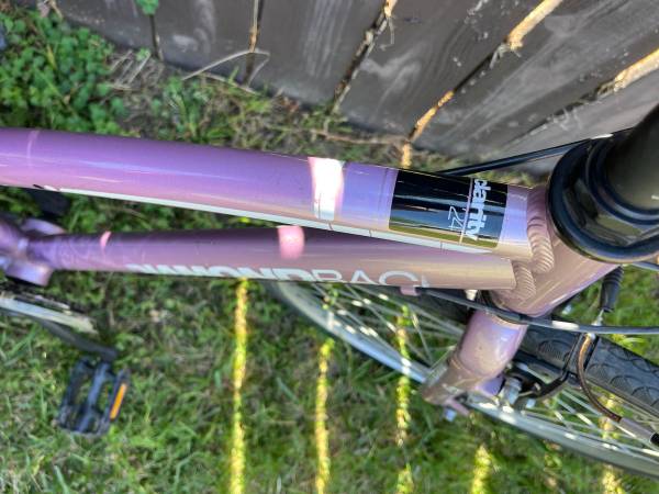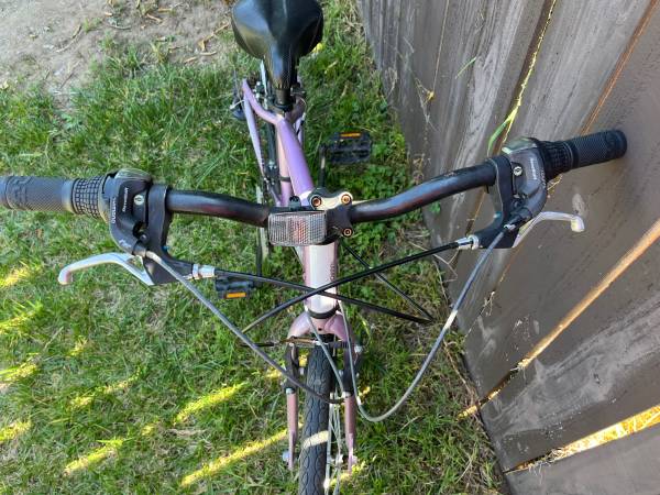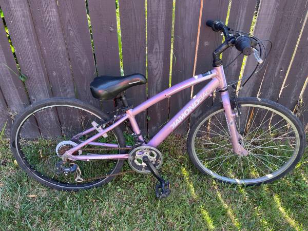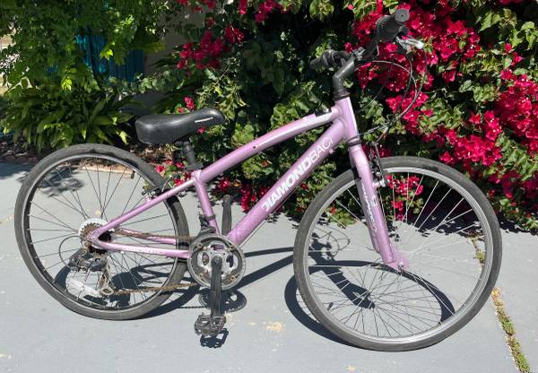 Diamondback bike is a hybrid with tires that work well on paved as well as dirt. It’s a pretty light purple color. This bike worked well for my daughter age 9-12. It has 12 gears.