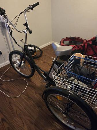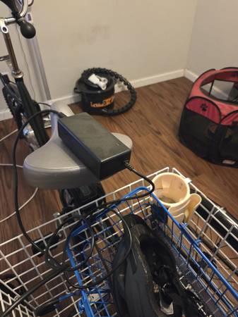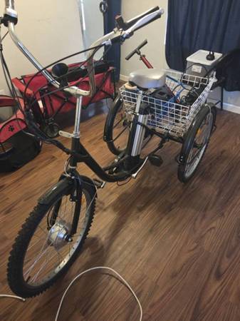Electric tricycle throttle. Comes with charging cord and Battery.. helmet and tire pump.