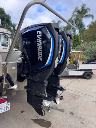 2020 Evinrude twin 250 outboard engines with only 530 hours on engines. Just serviced new impellers, lower unit oil, plugs, fuel filters, I have 4 gallons of the 2 cycle oil as well. I dock feature moves the boat lateral with independent steering control. 30 inch shafts, with Evinrude you can shorten to 25 inch very easily if need.