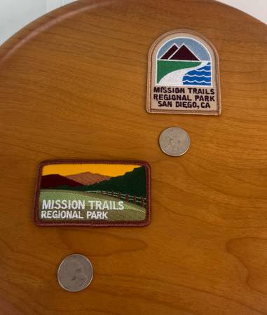 Two embroidered patches featuring Mission Trails Regional Parks in San Diego, CA One rectangular patch with stylized hills and trails One round patch with mountains, waves, and sun motif Can be sewn...