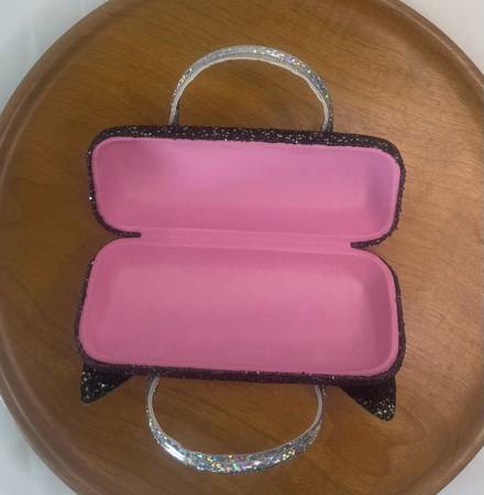 Glittery black cat face with pink ears, shiny handles, white whiskers and soft pink interior. Hard case. Uses: glasses case or playful mini purse Price: $10 Available AS-is, final sale. Ready for a...
