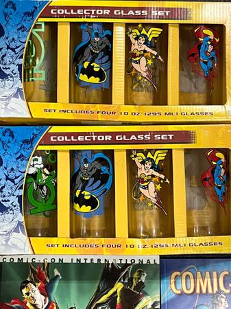 Superhero Collectables - these were mine purchased in the early to mid 2000s 12 superhero glasses - The glassware has never been used still in the original boxes - they are dusty Wonder Woman framed...