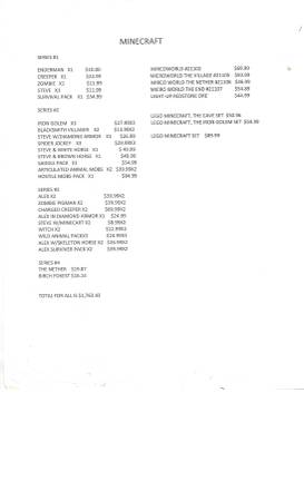 I have MINECRAFT Collectibles, Series #1, 2, 3, &4. See attached list it has all the prices that are what I paid for. This is a ALL or nothing Purchase. All pieces are in their original...