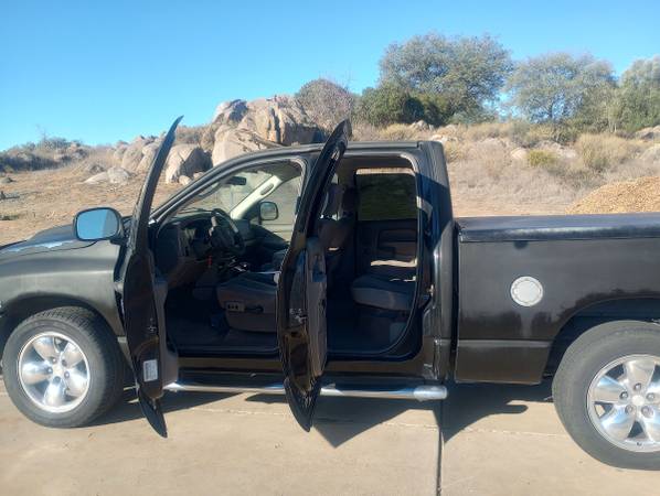 Perfect running 04 Dodge ram 1500 quad cab hemi 5.7 Magnum, current registration till May of 26, no check engine lights k&n Air cleaner system, hard tonneau cover, Dodge ram bedliner, tow package, oversized exhaust, 20 inch mag wheels, AC ice cold, base response speakers and amplifier, trucks ready for work, towing, reliable, never any accidents 152,000 miles. Clean Title in hand.
