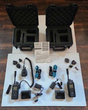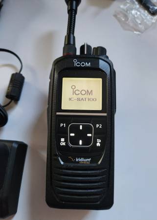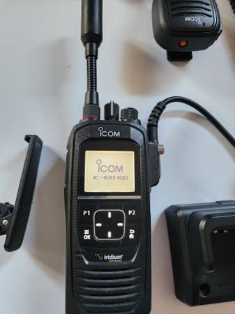 For Sale are Two Units - ICOM SAT-100 PTT Satellite Radios with many accessories. Virtually brand new. Only turned on for testing approximately 5 times for 10 minutes each time. Tests were made from Baja California to Texas, to San Diego and to Louisiana. Works loud and clear. All you have to do is set the locations anywhere in the western hemisphere for the Iridium Satellites to cast the coverage to the zones you choose on the Iridium online app.
