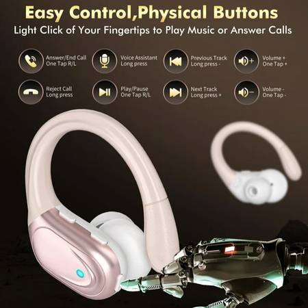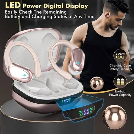 Designed with elastic and soft ear hooks, these Bluetooth sports headphones stay securely in place and provide ultimate comfort even during extended workout sessions. The earphones come with three different sizes of ear tips, ensuring a perfect fit for various ear sizes. With an IPX7 waterproof rating, they effectively resist water splashes and sweat, making them ideal for sports, fitness, workouts, and running. ENC Noise Cancelling Earbuds and Immersive Stereo. Upgraded 80-hour Playtime & LED Power Display.