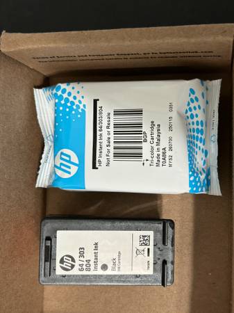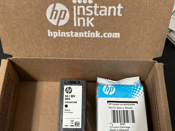 HP 64/303/804 Instant Ink cartridges, black and tri-color. I joined the HP instant ink program but I then I unsubscribed. I have two ink cartridges for an HP inspire 7900e printer. I opened the black cartridge but since I had unsubscribed from the HP instant ink program, the cartridge would not work in my printer. I put the protective tape that goes over the cartridge to protect where the ink comes out of the cartridge when I removed the instant ink cartridge from the printer. Both cartridges for free