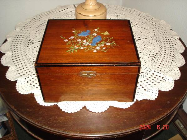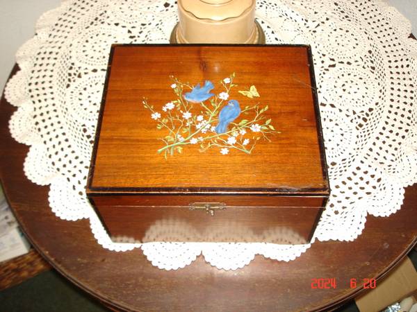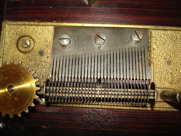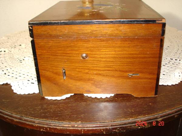 Nice Monopol disc music box. Plays 7 1/2" inch diameter steel discs. Beautiful inlaid top. Made by Leipziger Musikwerke / Paul Ehrlich & Co, Leipzig, Germany, [c.1890]. It has an auto shut-off and speed control. There is one disc that goes with this music box. It has a bit of black inlay missing on the top right as can be seen in last picture. The tip of the first tooth appears to be missing. The cabinet measures 10 1/2" wide x 8 3/4" d. x 5 3/4" h.