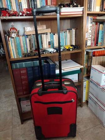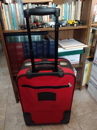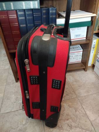 LARGE TRAVEL LUGGAGE SUITCASE--TELESCOPING HANDLE, ROLLS, RUBBER GRIP! CONDITION: EXCELLENT! Color: RED Dimensions: 22" High x 14" Wide x 9" Deep. Height (when telescoping handle is fully extended):...