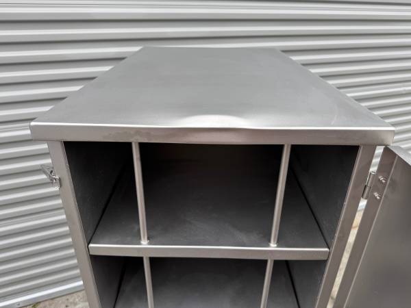 Up for sale is a rolling cabinet/shelf unit made entirely from 304 stainless steel with a matte bead blasted finish.