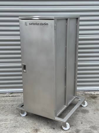 This cabinet was made for the pharmaceutical industry, meant to store and transport a 50 liter bag of fluid on each shelf.