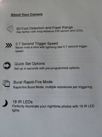 Stealth digital scouting camera, 60 foot detection and flash range, 0.7 second trigger speed, 18 IR LEDs and 16G SD card.
