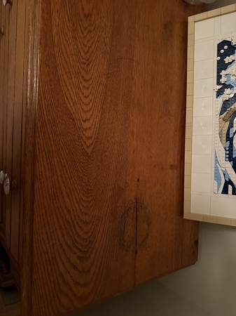 Solid wood dresser with super cute knobs. Has crack on top (see photo #2), but that only adds to its character and doesn't impact its utility. Would recommend this for occasional use since the drawers can be a bit finicky to open. We are moving and that is the only reason we are parting with this gem.