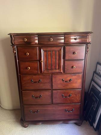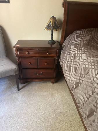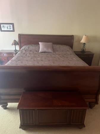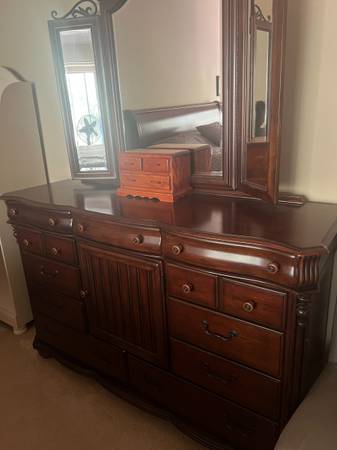 Master bedroom suite. California king with box spring and mattress. Two night stands, step, trunk, Armoir and mirror, large dresser.