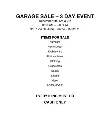 Garage Sale Days: 12/5, 12/6, 12/7 Time: 8 am to 2 pm Everything Must Go! Cash Only!! Also have a 2005 Honda CRF 250R for sale Lots of items!! Come check it out!!