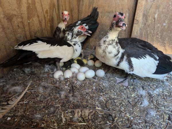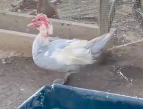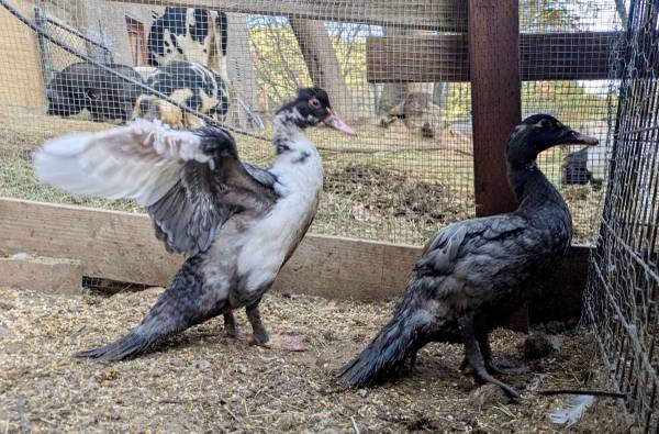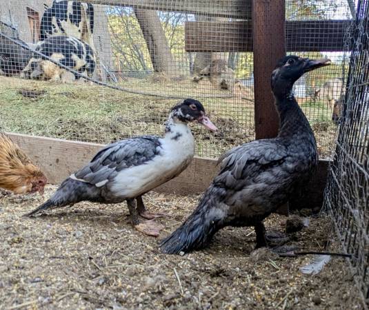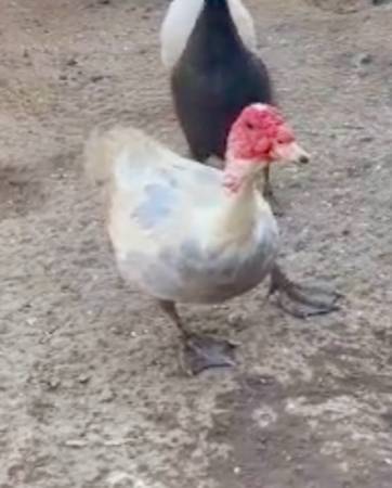 Two male Muscovy ducks for sale. $30 each or both for $50. They are three months old and already huge. Their grandparents were show ducks at the San Diego County Fair, so they have great lines. One is mostly all blue-grey, and the other is blue-grey and white. The first three pictures are the young ones for sale, and the last four pictures are the parents (not for sale).