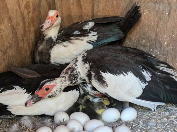 Muscovy ducks are quackless and therefore very quiet. They cannot breed with regular (domestic) ducks and are actually more closely related to geese. They can fly, but we are happy to clip their wings for you if you’d like.