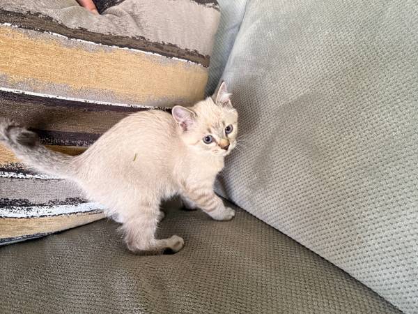 We are rehoming our adorable kitten! This little one is full of love, energy, and curiosity. With bright blue eyes and a soft coat, she’s not only beautiful but also affectionate and playful.
