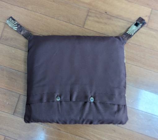 Brown/Bronze with accents. Velcro Ties keep the chair pad firmly in place. Button closure on the back with removable/washable cover. Gentle cycle or hand wash recommended.