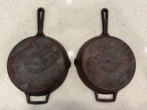 ARTISANAL KITCHEN SUPPLY 10” CAST IRON SKILLETS - 2 SIZE - 10” BOTH IN GOOD CONDITION AND WELL SEASONED