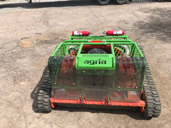 2023 Agria remote controlled brush mower. Extra blade belt, 2 extra fuel cans, additional battery, guard for front, 2 fire extinguishers, and removable cage to move tools into work site.