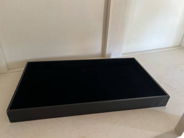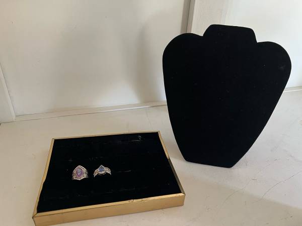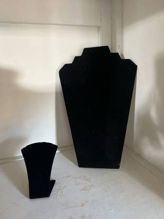 Black Felt Jewelry display fixtures. 2 large necklace, 2 medium necklace, 2 cardboard necklace, viewing/sorting box @ 8x15, tall metal necklace rack, 11 inch round and flat display, 12 inch earring display, watch holder, 7x6 ring display. In good condition. All for one price.