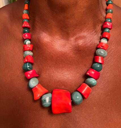 Super rare red coral necklace one of a kind design made with red coral and green striped polished agate stones. Absolutely gorgeous!!! Other styles of jade/stone necklaces available as well. Some in...