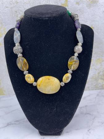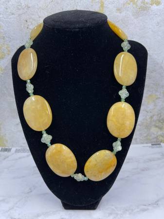 I hand string all my necklaces. This lovely large honey calcite necklace with green jade accents is summer personified. Antique silver toggle clasp. Measures approx. 20” long. I'm including pictures...