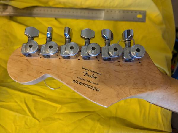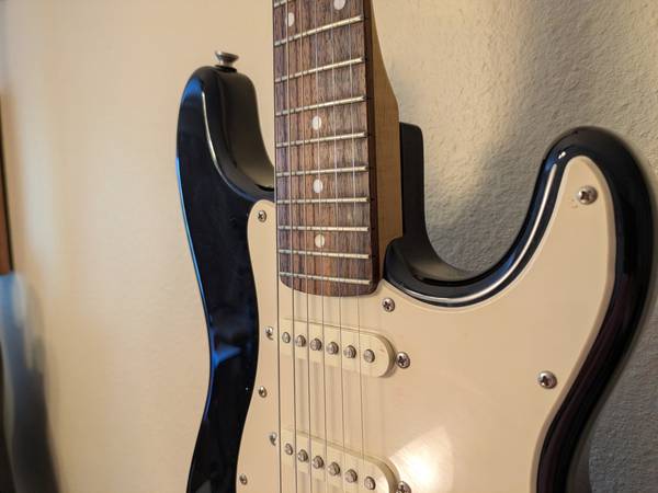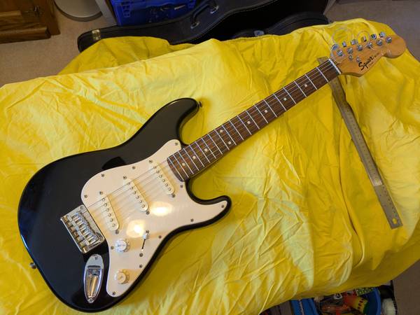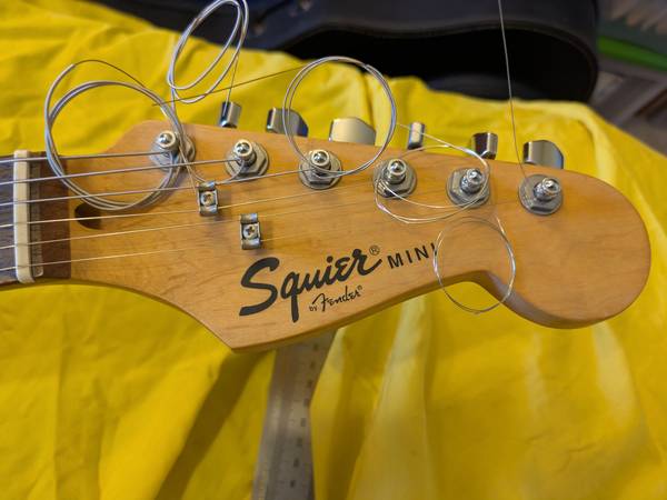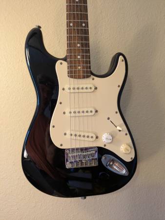 Fender Squire mini strat, ¾ size kids stratocaster guitar, has new strings and setup, plays great, looks great, overall very clean with a few small scratches. Minimal fret wear and locking tuners....