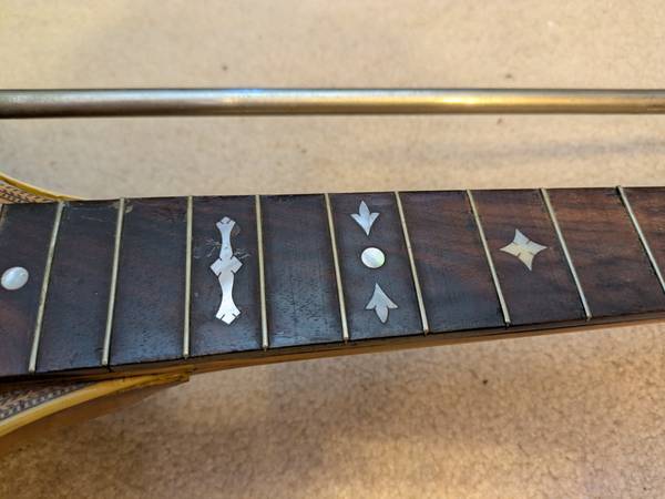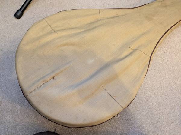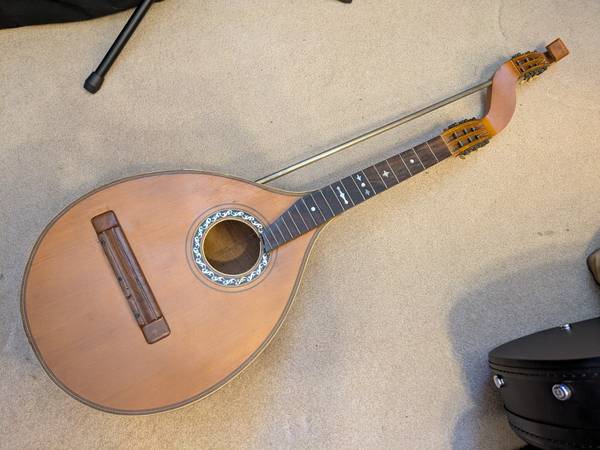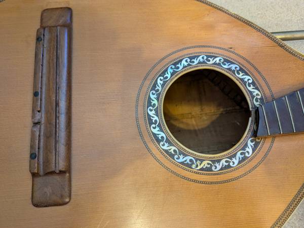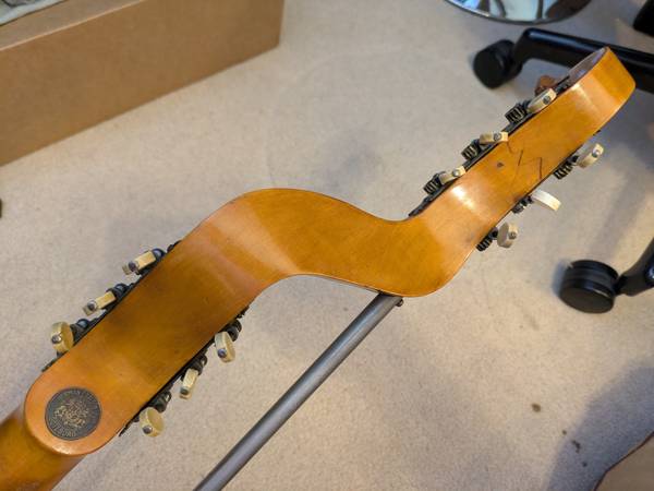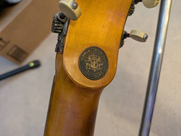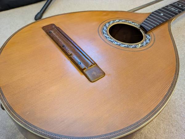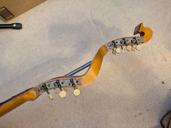 Lute – Herman Carlson Levin Goteborg, early 1900s, made in Sweden, Has crack in upper headstock, and where body meets neck, But otherwise very nice condition. Looks complete with what appears to be original nuts and saddle pieces (in box). Includes soft case in great shape as well. $950