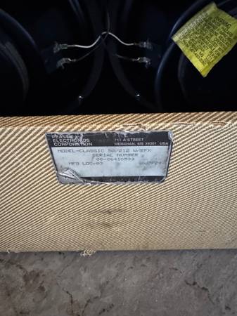 Killer sounding Peaveys Classic 50 from the 90’s. All tube and sounds great! No issues, everything works and comes with a foot switch. This is the best bargain in vintage tube amps going and blows the doors off the Fender Hot Rod series. Great clean sound and killer overdrive channel that goes from bluesy to metal. Plenty loud for any gig.