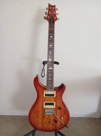 PRS Custom 24 SE with a spalted maple top (veneer) from the limited edition exotic top series. Wide/thin maple neck with rosewood fingerboard and 25" scale length. Mahogany body w/ maple cap. PRS 85/15s pickups. The guitar looks, plays and sounds excellent. Comes with a PRS gig bag.