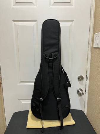 This guitar is in overall good condition and comes with a backpack style gig bag. It's perfect for beginners that want to learn how to play without spending too much money or a good travel or beach guitar. There is slight sticker residue on the left top of the neck.