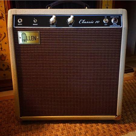 Allen Classic 10 single-ended Class A amplifier. 10 watts of grab n' go fun with a 10" speaker. Straight up VOLUME and TONE controls keep it simple plus a unique BOOST switch to punch up the mids and highs for a more Marshall-like tone. A hot rodded 5F2-A take-off with well-filtered solid-state power supply, cathode biased 6L6 power tube and high-gain 12AX7 based preamp. An Eminence Copperhead speaker in a generous sized 17" by 17" cabinet make this the ultimate practice/recording/small gig amp. This beautiful little 10W, 25lb hand-wired tube amp is easy on the eyes, the ears, the back and the wallet!