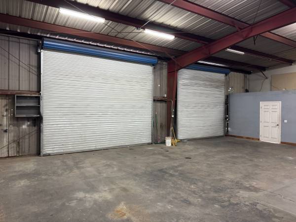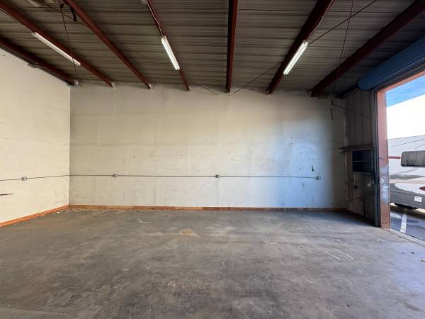 Ceiling height is approximately 15 feet with 3 phase power available. There are two garage doors, a 15x12 and a 12x12 which is unique to the complex as we installed the 15x12 door a few years ago for a tenant that needed it.