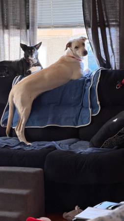 Sweet Cleo is 8 to 9 months old and weighs 35 to 40 pounds. She is great with dogs and cats. She is a little shy at first, but it’s very friendly.