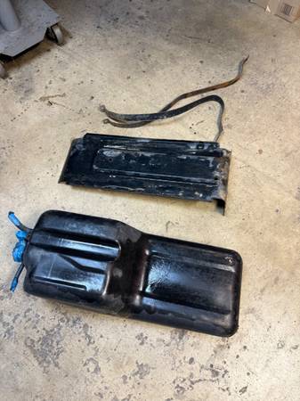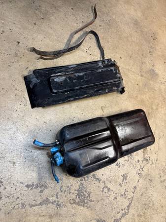 Auxiliary fuel tank, skid plate, and mounting straps Factory parts from a 1974 Bronco About 8 gal capacity, mounts under Bronco below driver's seat. Please call 619 Two77-Six nine seven 8