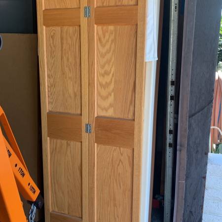 Really nice 29 5/8” x 79” solid oak bifold door. I was going to use as a room screen/divider but never got around to finishing the project. Prices doors of this quality start at $240.