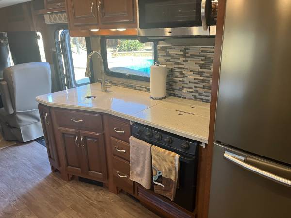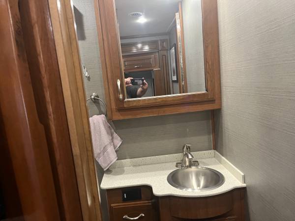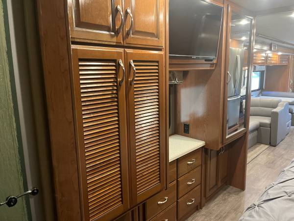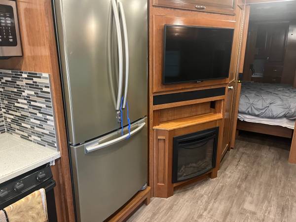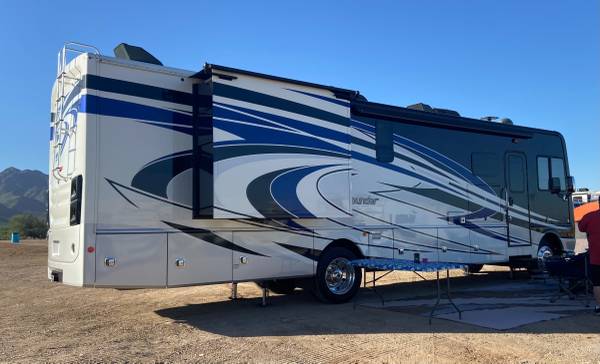 Like new 2018 Fleetwood bounder LX 35k model(36') ONLY 5945 miles with 2 slide outs, sleeps 8, king size rear bed, queen drop down overhead bed, dinette, L couch, 3 TV's inside and 1 outside with stereo, surround sound, satellite dish with dish network and 2 wally's,1 1/2 baths, fireplace, Ford V-10 gas engine, F21 chassis,100 gallon fresh water tank, 5K tow pkg, full body paint, auto leveling jacks, electric patio awning with LED light kit, blue under glow Led lights, auto start 7.0 Onan generator, electric reel power cord, 50 amp, larger 15Bu A/C's with heat pump, chrome pkg handles and mirrors with cameras and back up camera, whole coach water filtration, solar, plumbed for W/D, huge residential refer. 4 NEW house batteries, 1 NEW engine battery, NEW large slide topper, 6 NEW TOYO tires. NON SMOKING AND NO PETS. THIS IS GLAMPING GOOD AS IT GETS !!! clear title in hand.