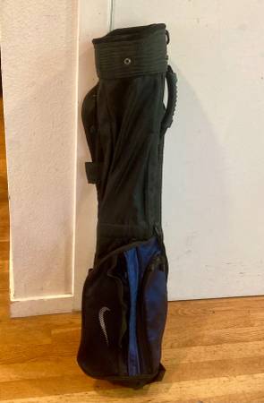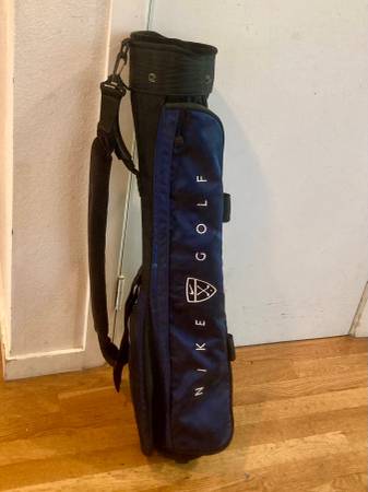 The blue Nike Sunday Bags of this model are VERY HARD TO FIND!! google; "VINTAGE Nike Golf Pencil Sunday Bag Thin 2-Way Black Blue Metallic RARE" . The only one on Ebay is in the Sold Items section. It sold for $205+ tax. Check it out. And mine is in BETTER SHAPE! Except for the hole. The hole is the reason it's $50, I would sell this for $150 normally. I put a piece of tape over the hole, not bad, it should hold for a while. See pics.